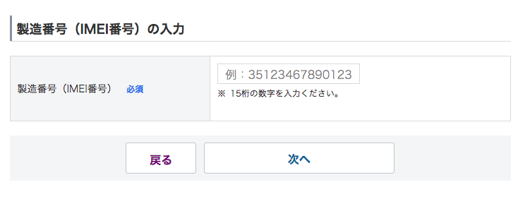 ・下にスクロールしてステップ2で取得したIMEIを入力して「次へ」。